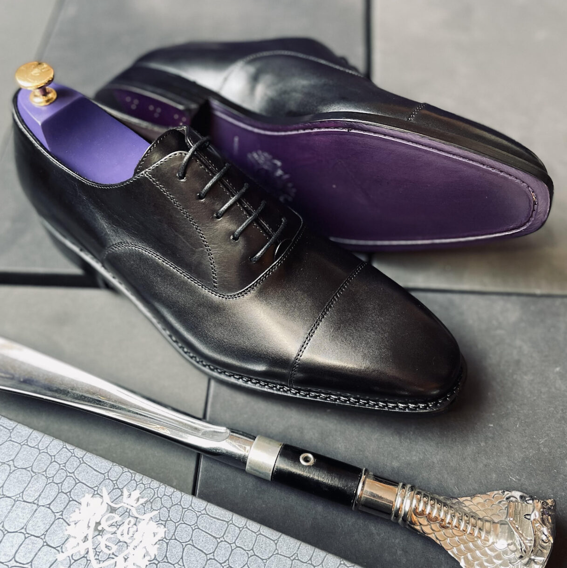 The Blackadder Oxford shoes have a distinctive design in which the eyelet area is concealed within the vamp. This model is a classic formal dress shoe which will never be out of style. These oxford shoes are a great example of the basic black cap toe oxfords.