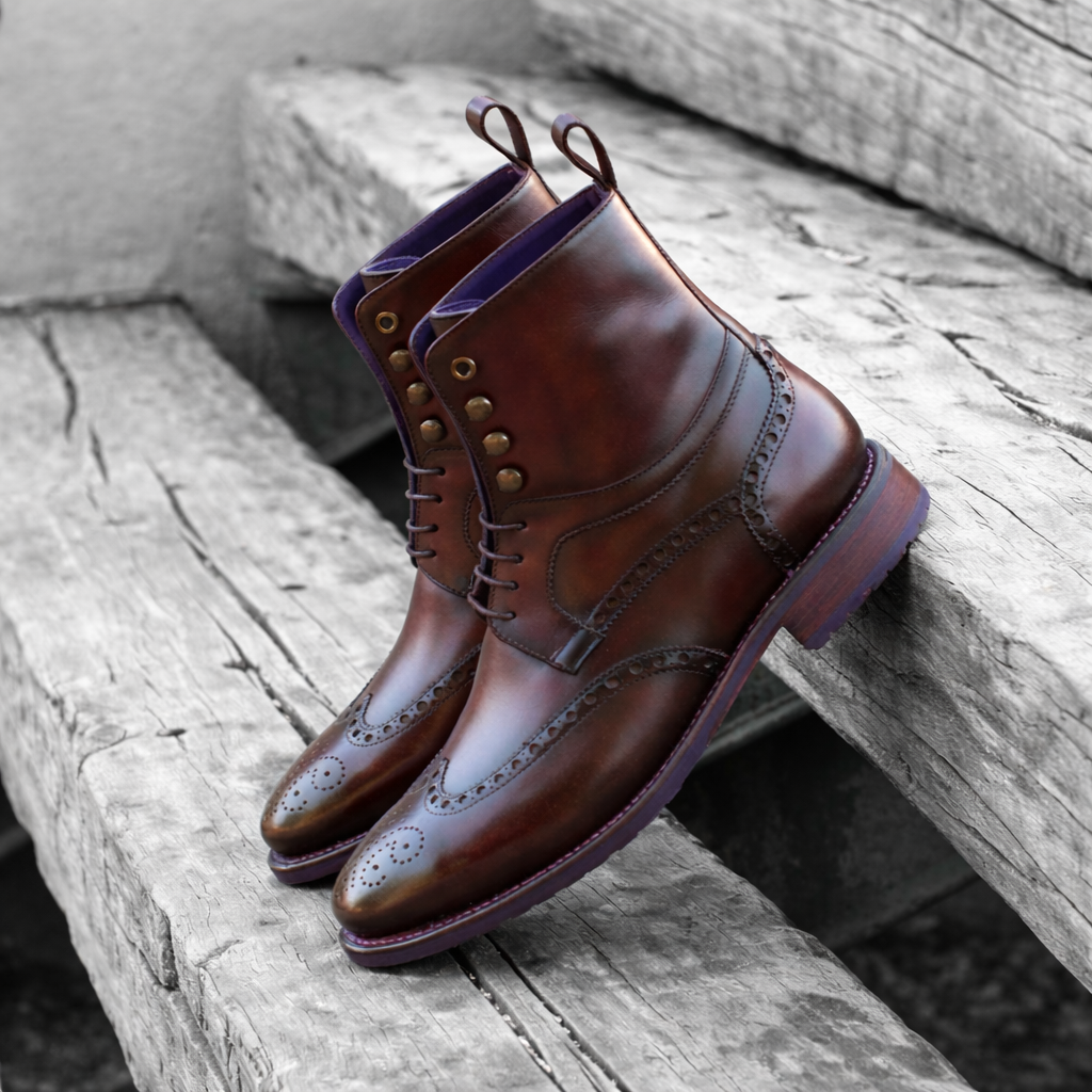 Part of the Artisan Collection the Bearcat laced boot has all the quality you would expect of the skilled shoemaker using traditional methods combined with modern innovations and fine materials. Rugged good looks characterise this wing-tipped brogue boot, it’s glowing oxblood colour polished to a silky sheen, the brogue detail is hand burnished completing the overall effect.